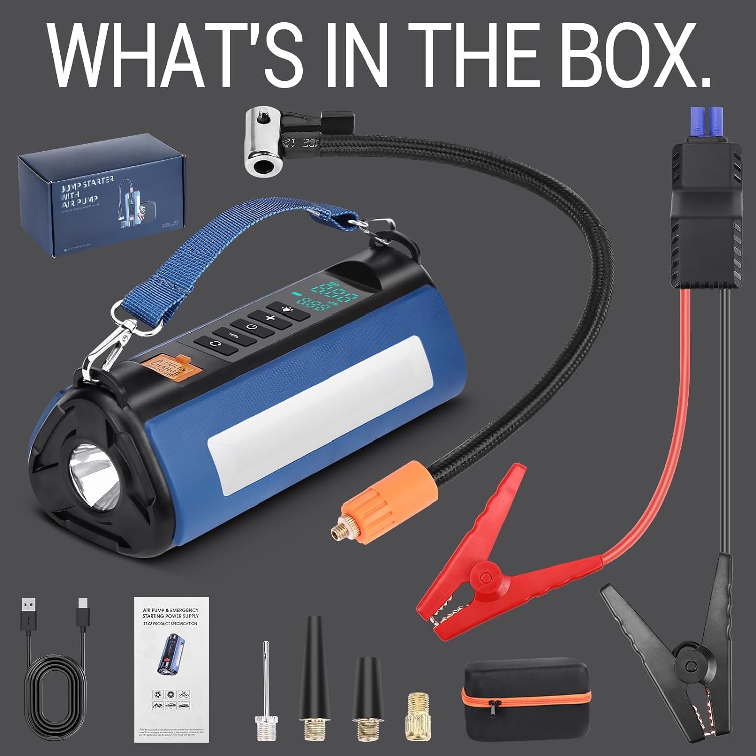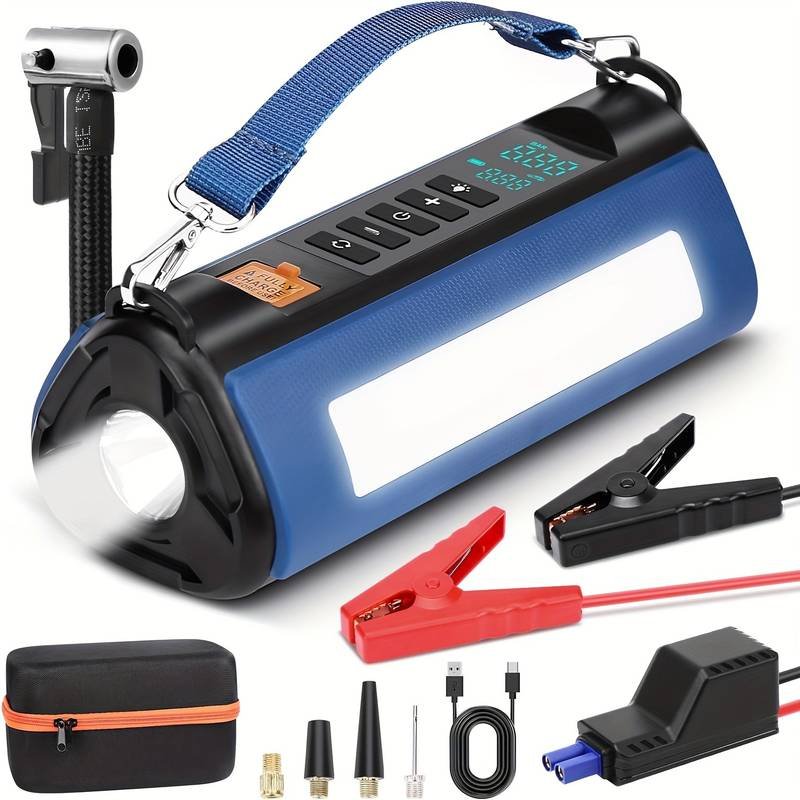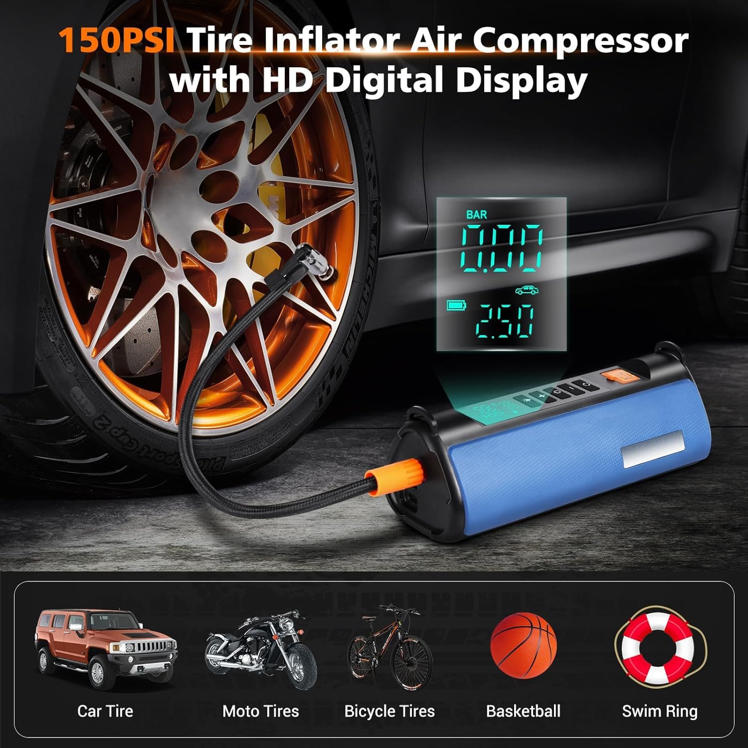 • منفاخ إطارات لاسلكي مع شاشة رقمية: منفاخ رقمي محمول ذكي بقوة 10.5 كجم لكل سم مربع للسيارة يدعم الإعداد المسبق الذكي والكشف عن ضغط الإطارات في الوقت الحقيقي ووظيفة إيقاف التشغيل التلقائي، وعند الوصول إلى القوة/ المساحة المطلوبة، لا مزيد من تكرار التعديل والتحقق. تشتمل مجموعة الطوارئ للسيارة هذه أيضًا على خرطوم هواء تمديد و4 فوهات مختلفة، ما يسمح لك بنفخ السيارات والدراجات والكرات والمراتب وعوامات حمام السباحة وما إلى ذلك.