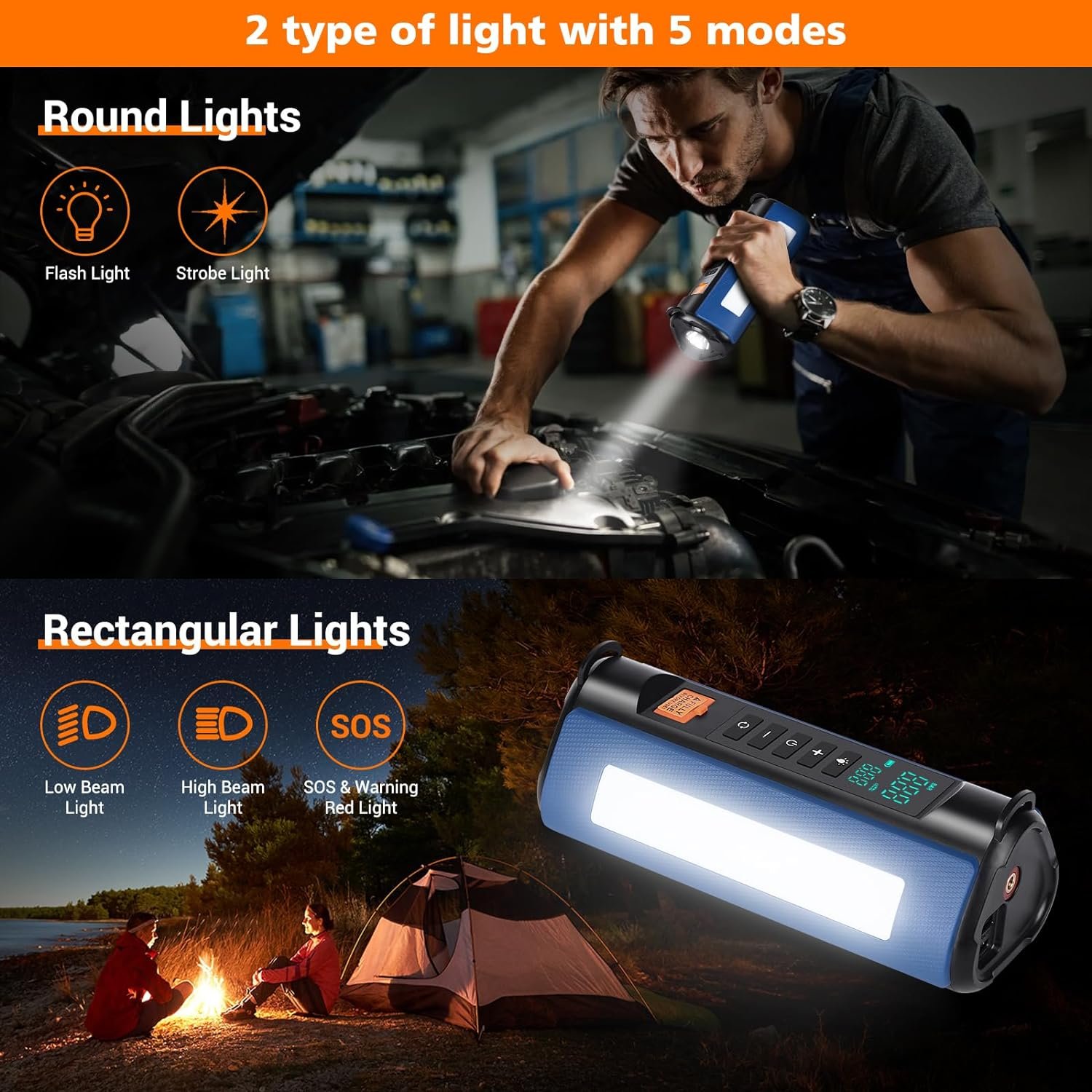 • نوعان من المصباح اليدوي في جهاز واحد: يتميز مشغل مضخة الهواء لبطارية السيارة بمصباح LED ومصابيح سي او بي، ما يوفر ما يصل إلى 25 ساعة من الإضاءة. 5 أوضاع اختيارية: مصباح يدوي (مستويان)، اس او اس، وميض، تحذير (أحمر). يوفر مصباح التخييم سي او بي أكثر سطوعًا مرتين من غيره. مصباح يدوي محمول متعدد الأغراض لحالات الطوارئ والمغامرات في الهواء الطلق.
