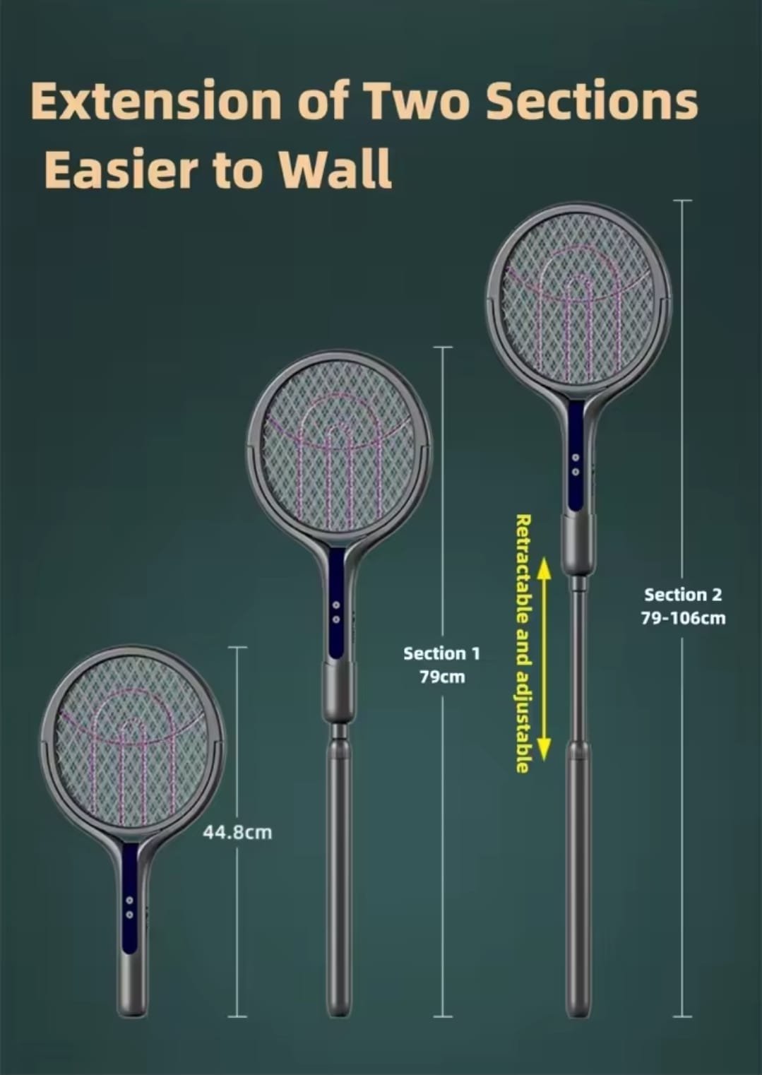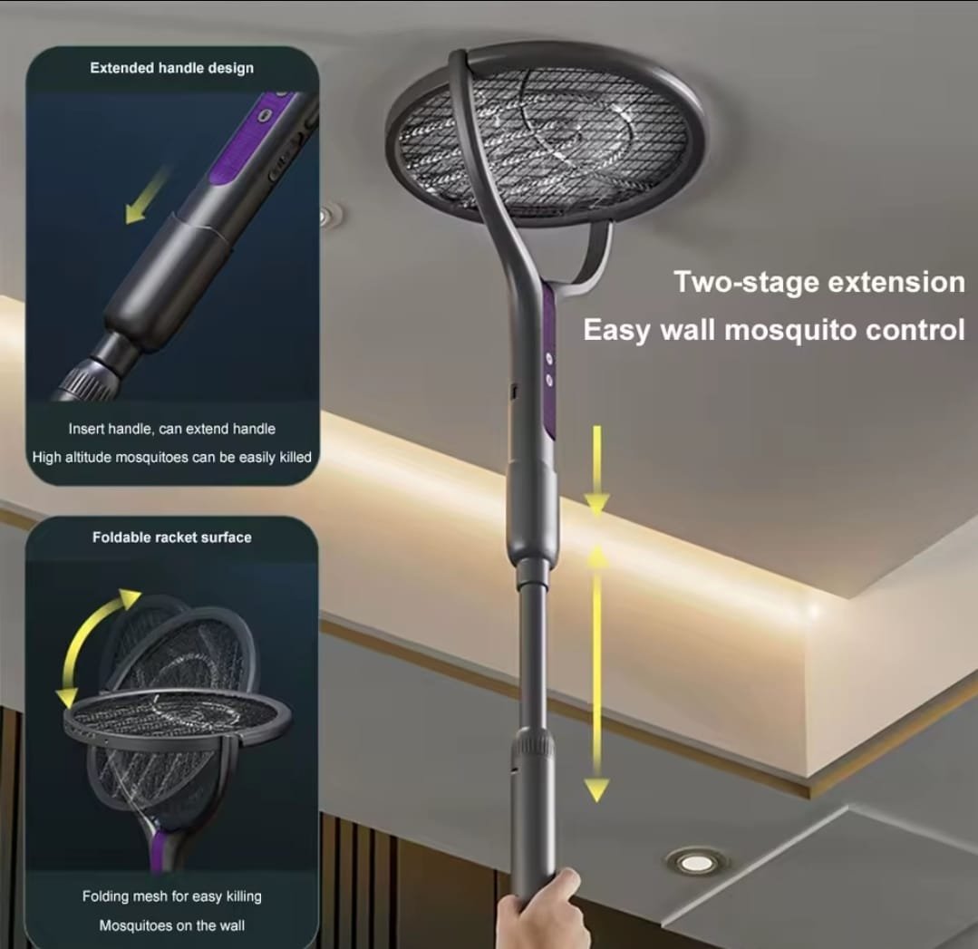مضرب ناموس كهربائي بذراع طويلة قابلة للتمديد + رأس قابلة للطي